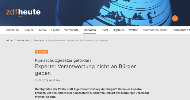 Das dritte Beispiel lieferte das ZDF: hier hat die ewige Versicherung bei den Öffentlich-Rechtlichen und der Berufspolitik ausgedient, natürlich müssten bei der Transformation von Energieversorgung und der Wirtschaft über „die Bürger mitgenommen“ werden, und es habe demokratisch zuzugehen. Wenn viele Technokraten darüber anders denken, etwa bei der „Agora Energiewende“, dann sprachen sie bisher nur in kleinen Zirkeln davon. Beim ZDF tut sich der als Experte vorgestellte Michael Kopatz vom Wuppertal-Institut – zurzeit beurlaubt für seine Dezernententätigkeit bei der Stadt Marburg – keinen Zwang mehr an. Dafür aber anderen. Denn bei dem Unternehmen Transformation, findet er, stört vor allem einer: der Bürger.