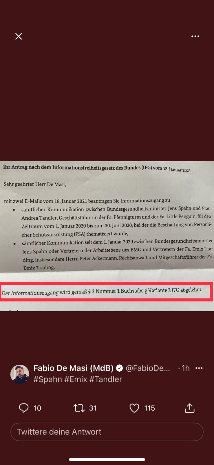 Der Abgeordnete der Linkspartei Fabio de Masi stellte bei der Bundesregierung einen Antrag nach Informationsfreiheitsgesetz, auf Einblick in alle Unterlagen zu Kontakten zwischen Spahn und Andrea Tandler und zwischen Spahn und Mitarbeitern seines Hauses in Sachen Emix Trading. Die Bundesregierung antwortete: „Der Informationszugang wird … abgelehnt.“