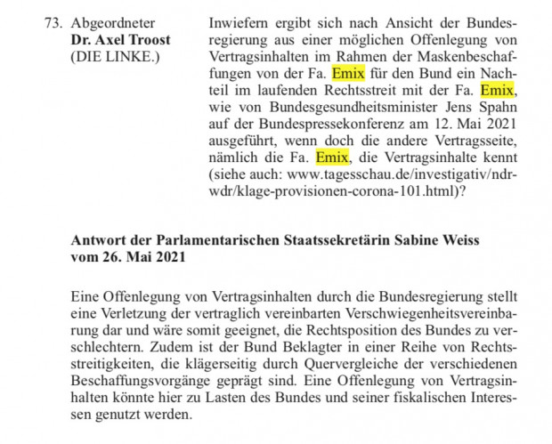 Spahns Staatssekretärin Sabine Weiss argumentiert, eine Offenlegung der Kontakte stelle nicht nur eine „Verletzung der vertraglich vereinbarten Verschwiegenheitsvereinbarung dar“, sondern „wäre somit geeignet, die Rechtsposition des Bundes zu verschlechtern“. Eine vertraglich vereinbarte Verschwiegenheit mit einer Firma in der Schweiz, die als Lieferant des deutschen Staates auftritt, rangiert also nach Ansicht der Bundesregierung höher als das Kontrollrecht von Abgeordneten.