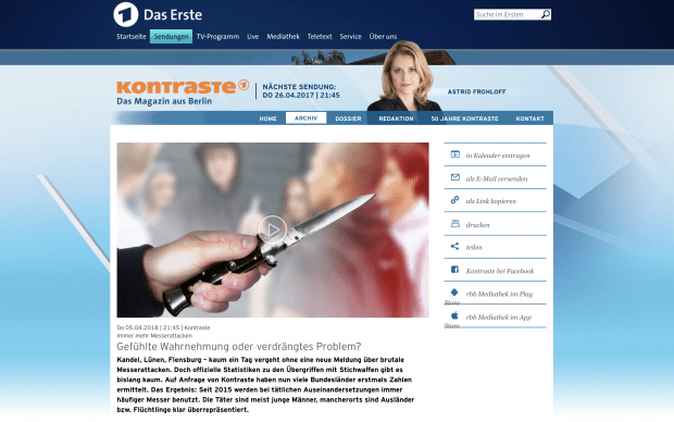 Die unbequeme Recherche hatte die Zahl der Messerdelikte in Deutschland und besonders die zeitliche Entwicklung dieser Zahl über die letzten Jahre zum Gegenstand. Unbequem war die Recherche wohl nicht deswegen, weil es schwer war, an diese Zahlen zu gelangen, denn auf Anfrage von Kontraste stellten zehn der sechzehn Bundesländer entsprechende Daten für den Zeitraum 2014-2017 zur Verfügung, welche das ARD-Magazin in einer übersichtlichen Grafik zusammengestellt hat: