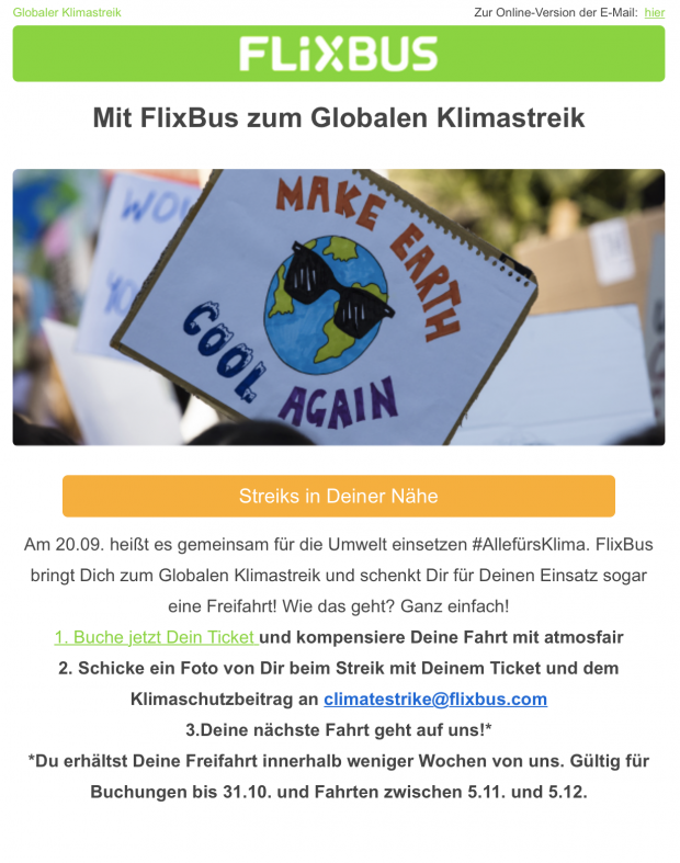 Für den 20. September 2019 bietet das Fernbusunternehmen „FlixBus“ etwas ganz Besonderes an: Eine Freifahrt für alle Teilnehmer an dem „Globalen Klimastreik“. Voraussetzung: Der Teilnehmer muss nicht nur am „Klimastreik“ teilnehmen, sondern auch mit einem Testimonal Werbung für das Reiseunternehmen machen.