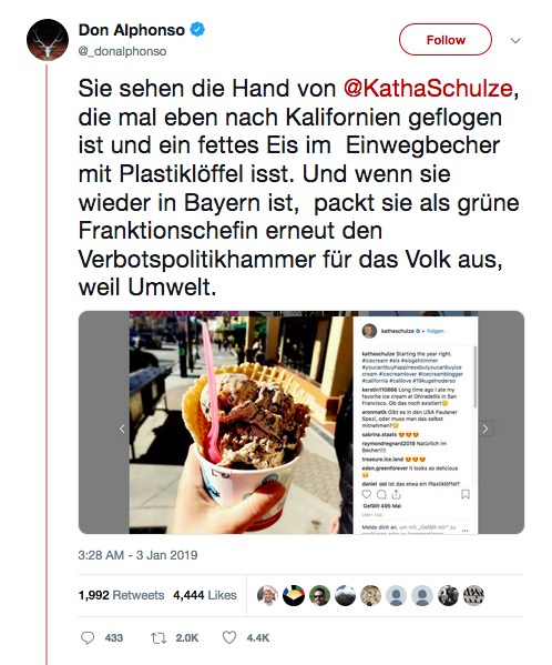 Ein Gegentrend ist auch schon auszumachen, der soll hier aber nicht näher besprochen werden. Nur soviel: Er nennt sich Greta-Narretei und persifliert den Greta-Narrativismus mit Bekenntnissen wie „Ich fliege zwar nicht, aber wenn, dann schamlos“ oder „Atmosfair? Kann ich mir nicht leisten“.