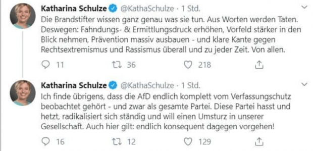 Auch die bayerische Grünen-Politikerin Katharina Schulze instrumentalisiert die Taten von Hanau für ihre Agenda. Schulze fordert mit Bezug auf die zehn Morde die Überwachung der gesamten AfD durch den Verfassungsschutz.