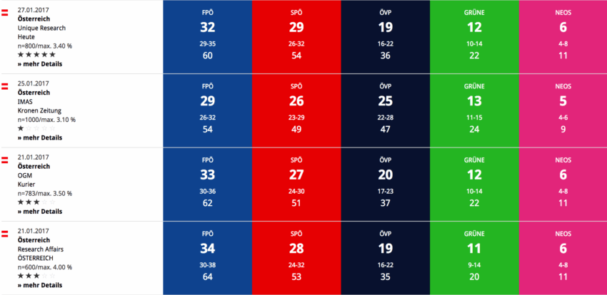 Warum wir auf Umfragen generell und in so hoch polarisierten Zeiten wie heute ganz aktuell nicht setzen dürfen, hat hier neulich ein Kundiger anschaulich dargestellt. Die in Österreich übliche Abbildung zeigt dem Leser freundlicherweise die Schwankungsbreite unterhalb der jeweiligen Momentnote mit an. Schauen wir auf die bei neuwal.com abgebildeten Zahlen, sehen wir, dass in Österreich ein Ergebnis nicht unmöglich ist, bei dem FPÖ, SPÖ und ÖVP annähernd gleiche Ergebnisse erzielen. Geht die ÖVP mit Sebastian Kurz statt Reinhold Mitterlehner an der Spitze ins Rennen, steigt die Möglichkeit, dass die NEOS den Wiedereinzug in den Nationalrat verpassen und Wähler, die sie verlassen, zahlreicher zur ÖVP als zu den Grünen wandern. Auch unter den Nichtwählern gibt es welche, die ein neues Gesicht an der ÖVP-Spitze aktivieren könnte.