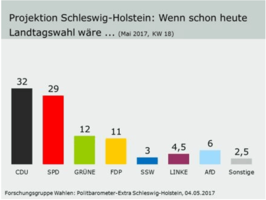 Womit klar ist, hinter die ermittelten Zahlen unter den anderen 65 % gehören mehrere Fragezeichen. Die gehören dort aber auch deshalb hin, weil wir an diesem Wahlsonntag möglicherweise wie beim ersten Durchgang der Präsidentenwahlen in Frankreich erleben, dass Umfrageergebnisse dort und in Deutschland (und Britannien wie USA) eine andere Qualität haben. Die Forschungsgruppe zieht aus ihren Zahlen den Schluss: „Wenige Tage vor der Landtagswahl in Schleswig-Holstein scheint außer einer großen Koalition und den Dreierbündnissen aus SPD oder CDU mit Grünen und FDP kein anderes Regierungsbündnis über eine Mehrheit zu verfügen.“