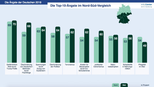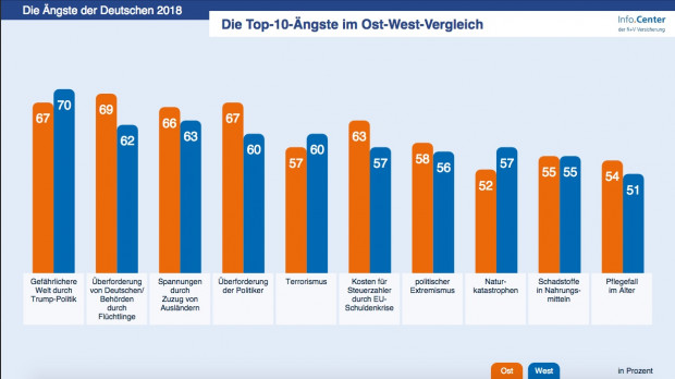 Besonders interessant ist ein zweiter Aspekt der Ergebnisse der R+V-Studie angesichts des in diesen Tagen wieder strapazierten Ost-West-Unterschiedes.