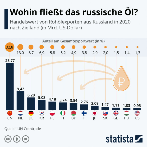 Der Warenwert russischer Ölexporte nach China belief sich bereits im Jahr 2020 nach Angaben von Statista auf rund 24 Milliarden US-Dollar – so viel, wie die gesamten Ölimporte von Deutschland, den Niederlanden, Polen und Italien aus Russland. In diesem Jahr befanden sich sechs EU-Staaten unter den Top 10 der größten Exportländer für russisches Öl. Diese Staaten müssen jetzt ihr Öl über andere Quellen beziehen etwa durch die Adria-Pipeline.