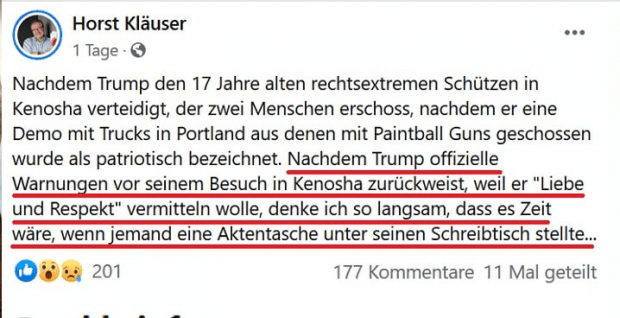 „Alter schützt vor Torheit nicht“. Offenbar auch nicht das Alter von pensionierten WDR-Journalisten. So verbreitete der frühere Hörfunkmoderator Horst Kläuser auf seinem privaten Facebook-Profil krude Mordphantasien über den amtierenden US-Präsidenten Donald Trump. „Nachdem Trump offizielle Warnungen vor seinem Besuch in Kenosha zurückweist, weil er ‚Liebe und Respekt‘ vermitteln wolle, denke ich so langsam, dass es Zeit wäre, wenn jemand eine Aktentasche unter seinen Schreibtisch stellte…“ Man muss kein Geschichtsstudium absolviert haben um zu erkennen, dass Kläuser hier bewusst auf das Stauffenbergsche Attentat auf Hitler anspielt. Kläuser löschte seinen Beitrag später.