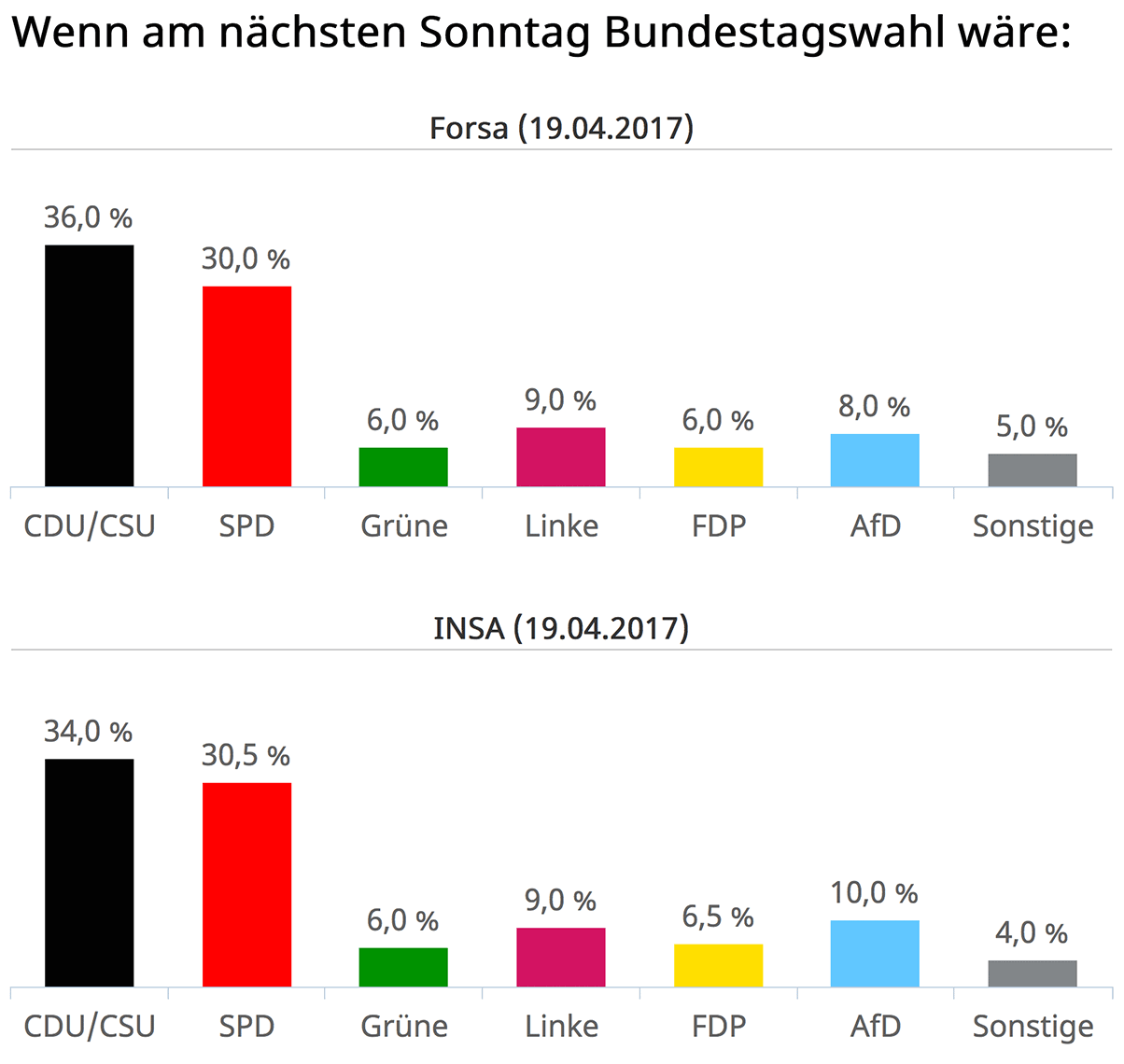 Die FDP zeigten die Institute mehrheitlich lange eher unter als über 5 Prozent. Seit die AfD von Umfragewerten um die 15 Prozent nach unten sinkt, scheint der Wiedereinzug der FDP in den Bundestag sicherer zu werden. Praktisch gleichzeitig sinken auch die Umfragezíffern für die Grünen. Die Gründe für beide Trends (ich weiß, mit dem Wort muss man vorsichtig sein) sind umgekehrt ähnlich. Die FDP profitiert von „bürgerlichen“ Wahlberechtigten, die sich schon mit der Wahl der AfD angefreundet hatten, sich aber wegen der dortigen Entwicklungen, von denen Frau Petry in ihrem Video spricht, wieder abwenden und ersatzweise der FDP zu. Den Grünen nimmt der – wenn auch abgeschwächt – anhaltende Schulzeffekt Wahlwillige weg. Je nach Ausgang der Landtagswahlen in Nordrhein-Westfalen kann das für die Grünen bedrohlich werden.