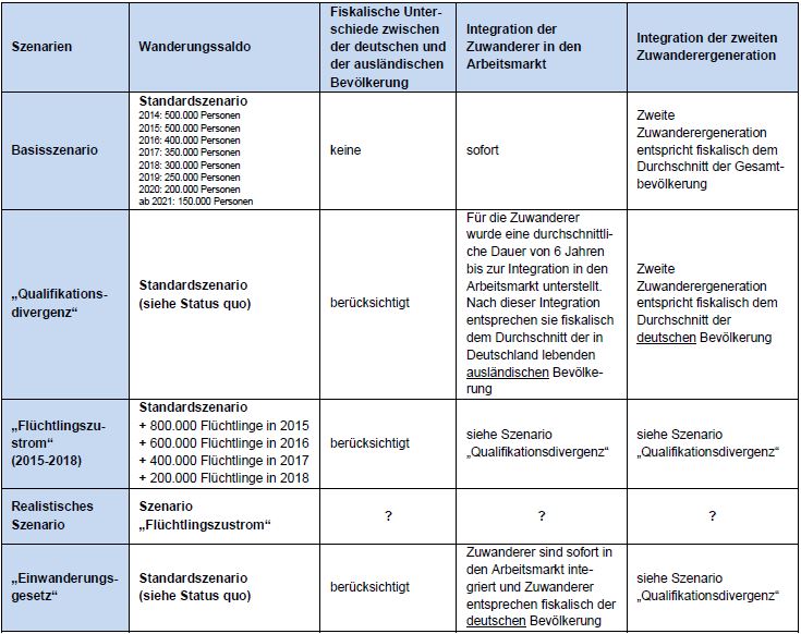 Bei den aktuellen Berechnungen auf Basis der Generationenbilanz für Deutschland von Prof. Dr. Bernd Raffelhüschen, Vorstandsmitglied der Stiftung Marktwirtschaft, wird unterstellt, dass bis zum Jahr 2018 insgesamt 2 Millionen Flüchtlinge nach Deutschland kommen und eine Integration in den Arbeitsmarkt innerhalb eines Zeitraums von 6 Jahren gelingt. Scheitert die Integration hingegen dauerhaft, drohen noch deutlich höhere Kosten.