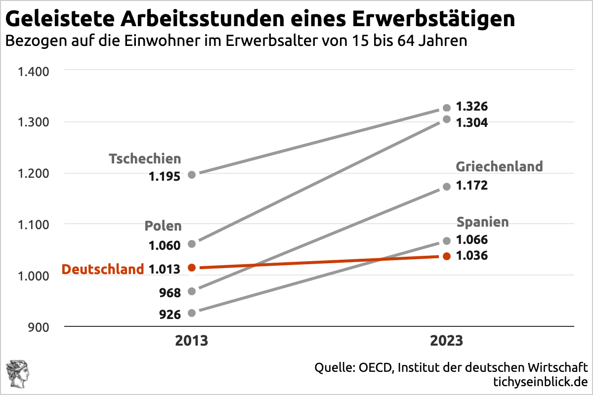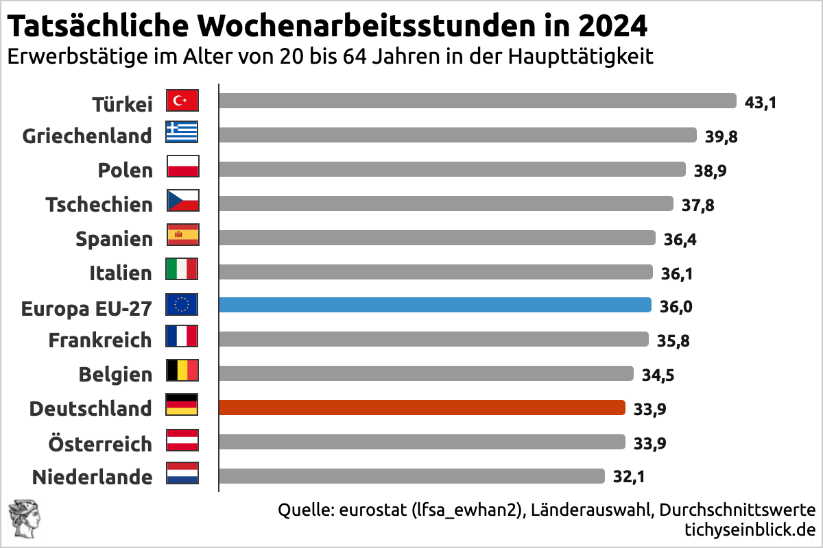 Da hege ich doch den einen oder anderen Zweifel, bei der Statistik zur Wochenarbeitszeit im Ländervergleich. Ok, die Osmanen haben Amerika entdeckt und danach eine pro-Kopf Verschuldung von ca. 170.000€ angehäuft (Deutschland nach Merz ca. 14.000€). Zudem steht im Koran das harte Arbeit Glücklich macht. Aber die Griechen?? Da erinnere ich mich doch an die Demonstranten-Damen, die nach der Griechenlandpleite gegen ihre Entlassung aus dem Staatsdienst protestierten. Das Finanzamt Athen wollte seine Putzfrauen entlassen, weil, so das Argument, man im Finanzamt gar nicht putzen könne. Alle Gänge, Büros bis hin zu den Toiletten war seinerszeit komplett mit Aktenberge zugestellt. Und da die EU befahl zu sparen, waren die Putzfrauen dran. Und jetzt kommt’s, es demonstrierten 700 Putzfrauen die im Finanzamt Athen soweit wie möglich für Sauberkeit sorgten. 700 Putzfrauen die für einen gut bezahlten Job demonstrierten, den sie laut Finanzamtsleitung unmöglich jemals ausführen konnten. Zudem wurden die Stellen vererbt, d.h. es war ein sicherer Generationenjob. Nach meiner Statistik haben die Damen also 39,8 Std. Zuhause geputzt und sind vom Staat dafür bezahlt worden. Persönlich kenne ich Niemanden der im Schnitt, und in Deutschland, eine 33,9 Std. Woche hat. Aber bei einer fast 50%igen Staatsquote im neuen Sozialismus, darf man sich auch nicht mehr über die 33,9 Std. wundern.