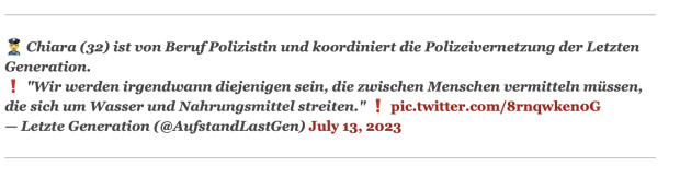 Nach den Anschlägen auf die Flughäfen in Düsseldorf und Hamburg in der letzten Woche kursierte im Netz ein Tweet, in dem eine Chiara angab, die Polizeiarbeit für die Letzte Generation zu koordinieren. „Chiara (32) ist von Beruf Polizistin und koordiniert die Polizeivernetzung der Letzten Generation. ‚Wir werden irgendwann diejenigen sein, die zwischen Menschen vermitteln müssen, die sich um Wasser und Nahrungsmittel streiten.‘“ Vorname und Altersangabe im inzwischen gelöschten Tweet sprechen dafür, dass es sich um die Bundespolizistin Chiara Malz handelte.