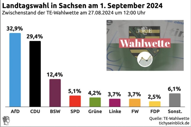 So haben die Teilnehmer der TE-Wahlwette Sachsen bisher im Durchschnitt das Wahlergebnis des 1. September eingeschätzt.