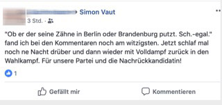Nicht nur die Genossen ließen sich täuschen. Auch die Regionalzeitung „Märkische Allgemeine“ (laut Wikipedia seit 1. Januar 2012 im Besitz der Madsack Mediengruppe, bei der wiederum die SPD über Beteiligungen größte Kommanditistin ist), schrieb laut SKB TV, Vaut lebe seit einigen Jahren mit seiner Frau in Brandenburg an der Havel und sei im SPD-Ortsverein Neustadt-Wilhelmsdorf aktiv. Was allesamt nicht stimmt.