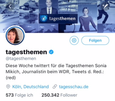 Sonia Mikich, Chefredakteurin des WDR, hat für eine Woche den Twitter-Account der Tagesthemen übernommen. Das Konzept, dem Account „neues Leben einzuhauchen“, indem man diesen abwechselnd von verschiedenen Redakteuren der Öffentlich Rechtlichen übernehmen lässt, wird seit wenigen Monaten realisiert (dazu Dr. Kai Gniffke am 20.09.2017 im Tagesthemen-Blog).