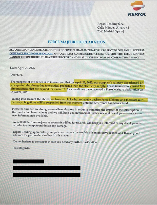 Dass es aber schon vorher Probleme mit der Stromversorgung gab, zeigt ein Brief von Repsol vom 24. April 2025, in dem das Unternehmen auf „eine unerwartete Unterbrechung aufgrund von technischen Problemen mit der Stromversorgung“ hinwies. In diesem Brief warnte Repsol einige seiner Großkunden, dass die Produktion in der Raffinerie in Cartagena ausgesetzt würde, bis der Vorfall vollständig behoben sei. Nach Angaben von Informanten handelte es sich um einen „größeren Stromausfall außerhalb der Anlage“, dessen Ausmaß Repsol dazu zwang, eine Klausel über „höhere Gewalt“ geltend zu machen, wie es in dem Schreiben vom 24. April heißt.