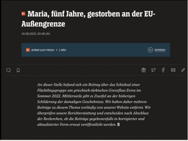 Vier Artikel widmete der Spiegel der Geschichte. Unter dem Titel „Todesfalle EU-Grenze“ findet sich aber nicht mehr die traurige Geschichte einer kleinen Flüchtlingsgruppe, sondern mittlerweile nur noch ein Statement der Redaktion.
