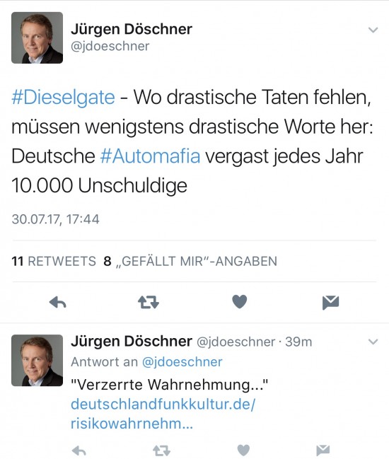 Das ist nicht nur »misslungen«, wie das halb verständnisvoll manche schreiben, sondern eine unglaubliche Sprachtat. Möglicherweise nach einem Anruf der WDR-Rechtsabteilung (oder war’s ein deutliches Gespräch mit WDR-Fernsehdirektor Jörg Schönenborn?) stolpert Döschner zurück und twittert: »Für d Verwendung d Wortes »vergasen« entschuldige ich mich ausdrücklich. War nicht m Absicht, d Abgasskandal in Beziehung z Holocaust z setzen.«