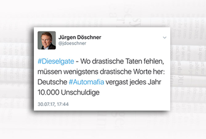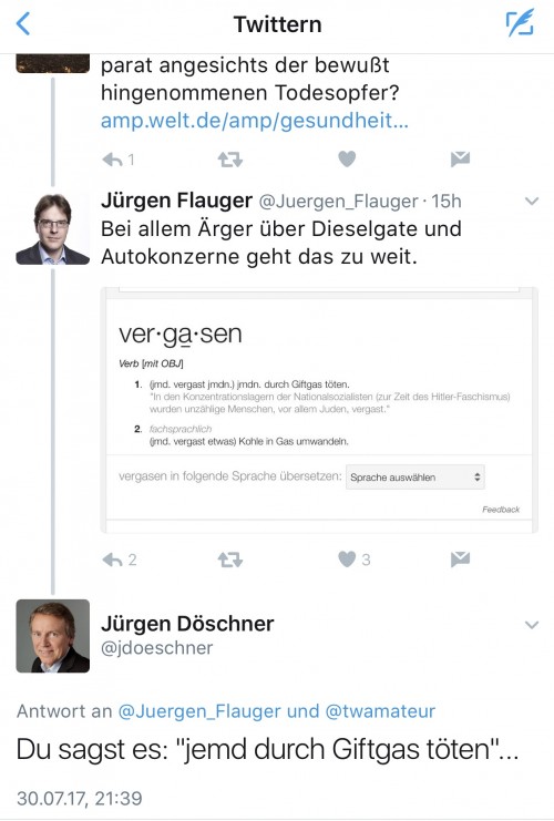 So richtig begriffen hat er nicht, was er da angerichtet hat. Er versucht, auf den folgenden Shitstorm hin mit einem Zitat aus dem Duden zu verharmlosen: »Mein Tweet z #Dieselskandal war provokant, aber kein Vergleich m Holocaust. »Vergasen« steht lt Duden f »Töten durch Giftgas« – hier:Abgas.«