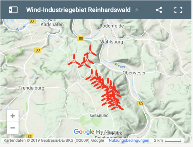 „Ein weiterer Schritt zum Bau von Windrädern im Reinhardswald ist getan“, jubelt die Hessisch/Niedersächsische Allgemeine aus Kassel: „20 Windräder sind für den Windpark im Reinhardswald bestellt. Die Bauarbeiten sollen im Oktober 2020 nach erteilter Genehmigung starten.“