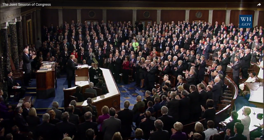 Trump zählt seine ersten Erfolge auf. Er nennt Firmen, die jetzt neue Jobs in den USA schaffen wollen, seinen „Deal“, der das F-35-Kampfflugzeug hunderte Millionen günstiger gemacht habe. Er habe einen Einstellungsstopp für nicht-militärische und nicht notwendige Bundes-Beschäftigte verfügt. Einen Anti-Korruptions-Erlass unterzeichnet, der bestimmt, dass Abgeordnete erst nach fünf Jahren Lobbyjobs übernehmen dürfen, und für ausländische Regierungen überhaupt nicht. (An dieser Stelle guckten die Demokraten besonders verbittert.)