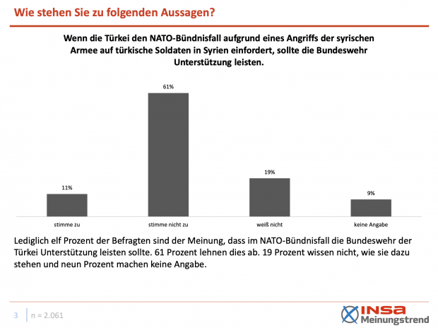 Wie eine repräsentative Umfrage von Insa-Meinungstrend unter 2.061 Befragten zeigt, sind nur 11 Prozent der Meinung, dass die Bundeswehr Unterstützung leisten sollte, wenn die Türkei aufgrund eines Angriffs auf türkische Soldaten in Syrien den Nato-Bündnisfall einfordert. 61 Prozent sind entschieden dagegen, 19 Prozent antworten „weiß nicht“, neun Prozent gar nicht.