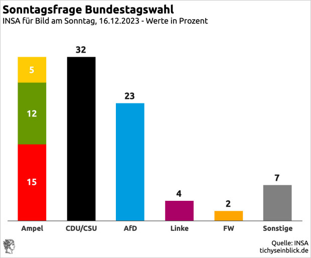 In der Woche der „Haushaltseinigung“, sprich des Sand-Streuens in die Augen der Bürger, verlieren die Ampel-Parteien 20 Prozentpunkte im Vergleich zur letzten Bundestagswahl: SPD, Grüne und FDP kommen zusammen nur noch auf 32 Umfrage-Prozente (im „Sonntagstrend“, den das Meinungsforschungsinstitut Insa wöchentlich für die „Bild am Sonntag“ erhebt).