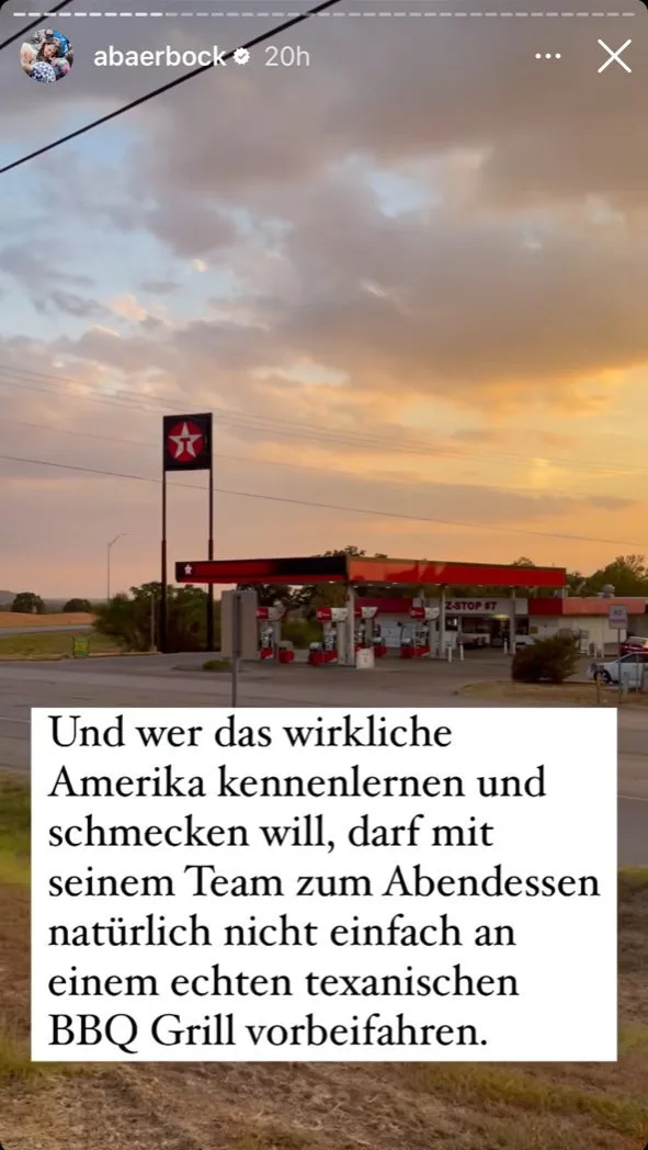 Nach einigen Terminen in Austin ging es weiter zum 238 Kilometer entfernten Houston. Es sollte die kürzeste Strecke von Baerbocks Reise werden, zu diesem Zweck setzte sich die deutsche Außenministerin samt Delegation in den Bus. Unterwegs machten sie noch Halt. Auf Instagram ließ sie ihre 575.000 Fans wissen: „Und wer das wirkliche Amerika kennenlernen und schmecken will, darf mit seinem Team zum Abendessen nicht einfach an einem echten texanischen BBQ Grill vorbeifahren.“