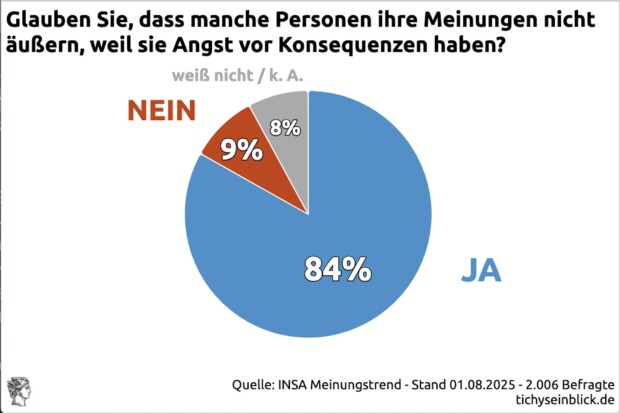 Die Anmaßung im EU-Gerichtshof und im politmedialen Komplex ist verwandt. 84 Prozent der Befragten fürchten, dass sie in Deutschland ihre Meinung aus Angst vor Konsequenzen nicht mehr frei äußern.