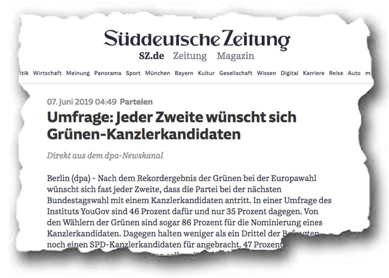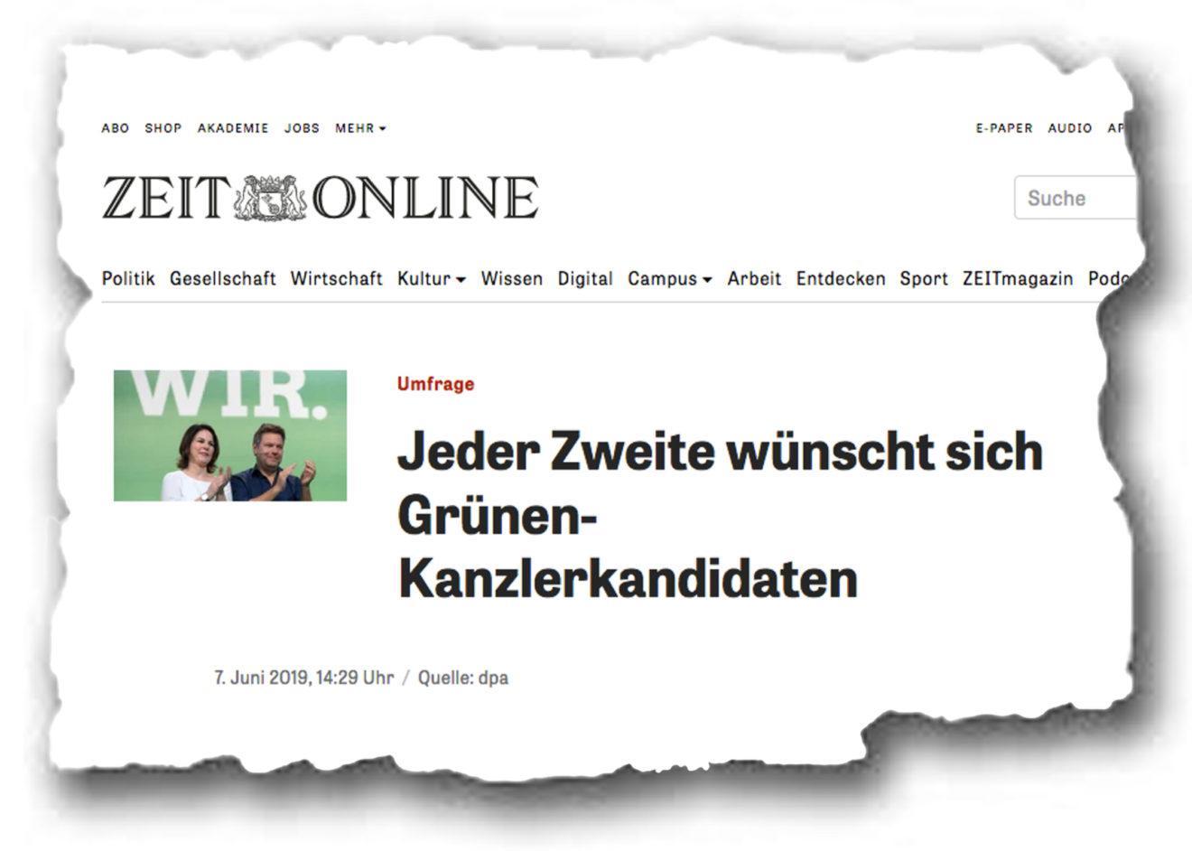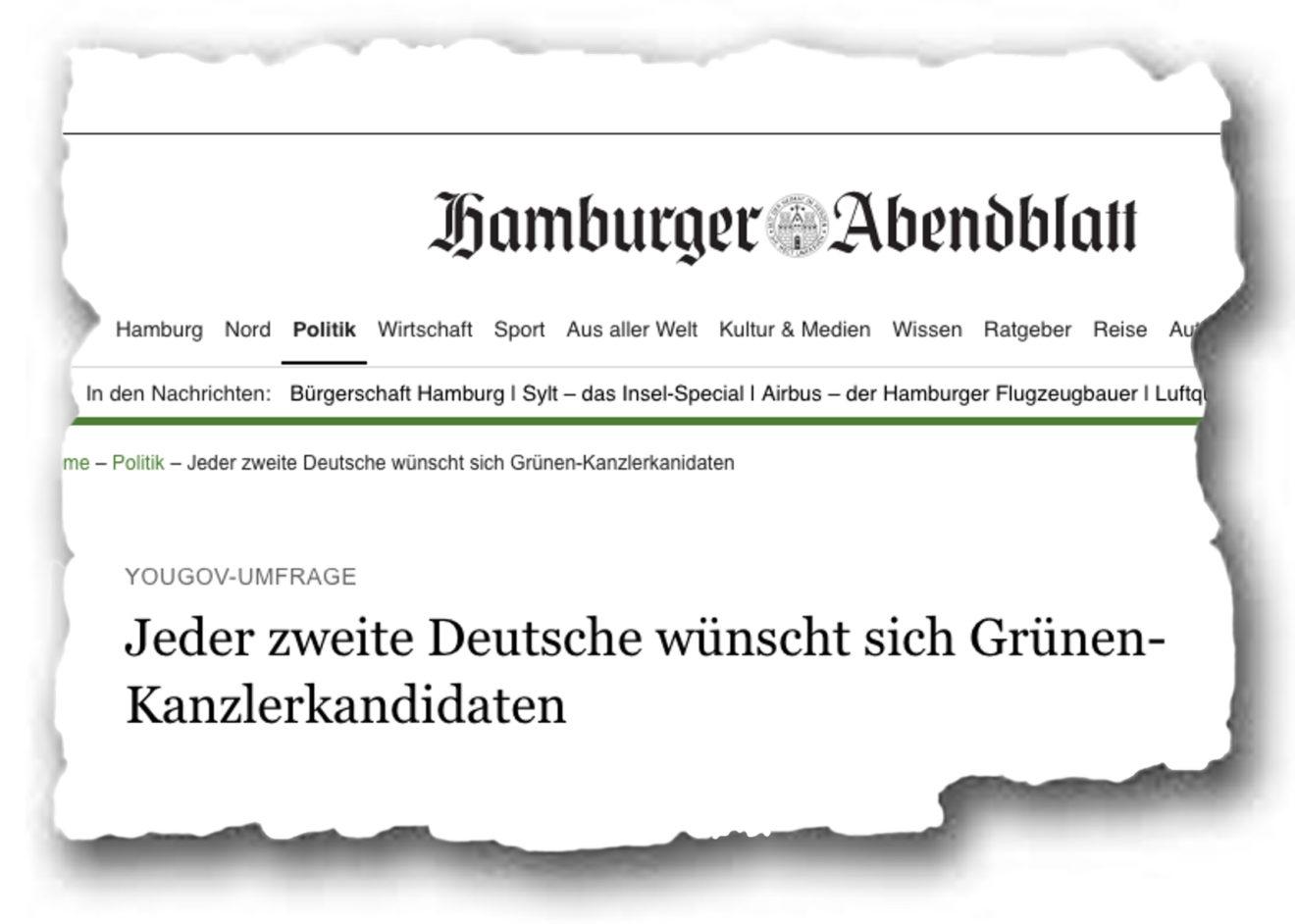 Wünscht jeder zweite Deutsche für die nächste Bundestagswahl einen grünen Kanzlerkandidaten? Das jedenfalls hatte die Nachrichtenagentur dpa am 7. Juni unter Berufung einer Umfrage des Instituts YouGov berichtet, die exklusiv in ihrem Auftrag durchgeführt wurde.