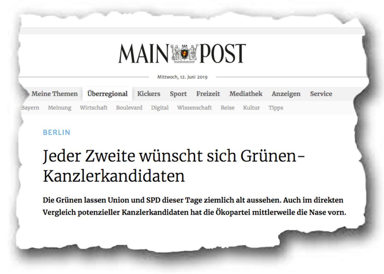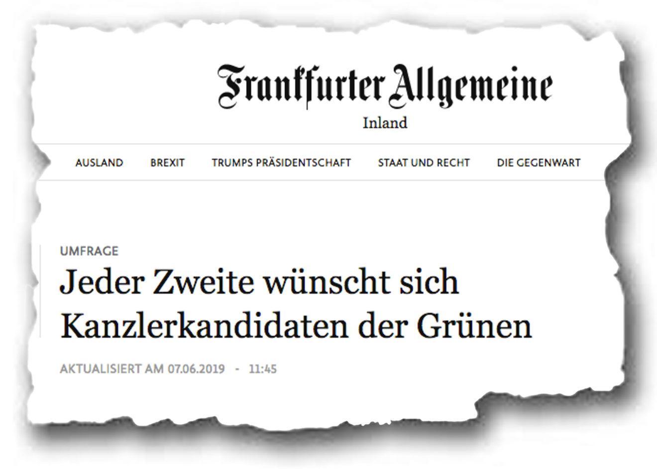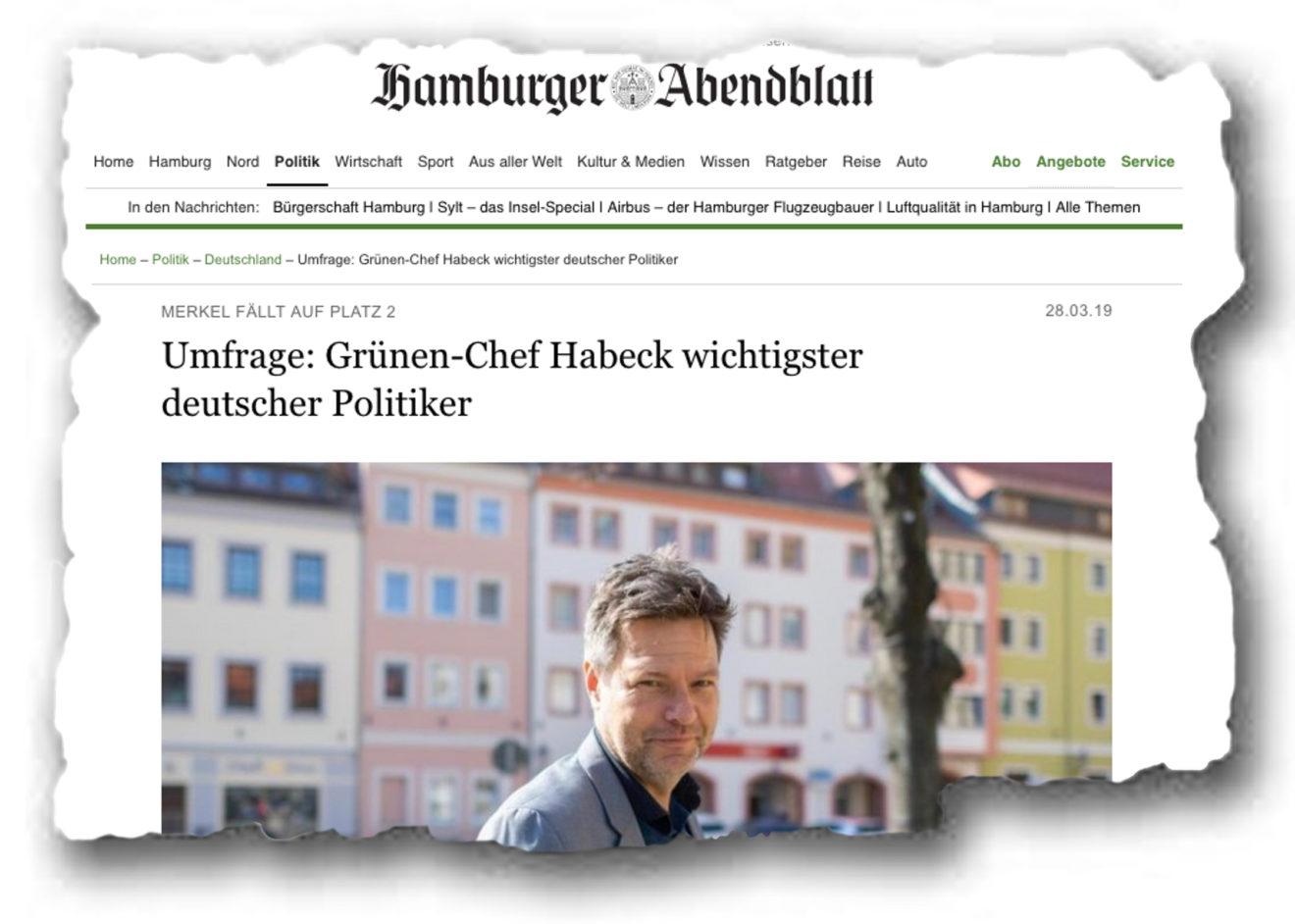 Eine ähnliche Verschiebung der Datenlage in Überschriften und Ton erlebten die Leser von Zeitungen und Online-Plattformen vor ein paar Monaten. Im März 2019 hieß die Meldung: „Robert Habeck auf Platz eins der wichtigsten Politiker.“ Tatsächlich: ein Politiker ohne öffentliches Amt, dessen Partei die kleinste Fraktion im Bundestag stellt, soll die wichtigste politische Person sein?