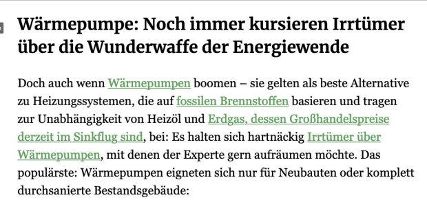 Bei Herrmann handelt es sich um den bisher prominentesten, nicht um den einzigen Fall der politischen PR-Welle, in dem die Wärmepumpe passend zu den Plänen von Robert Habeck als günstige und universell geeignete Heizalternative angepriesen wird.