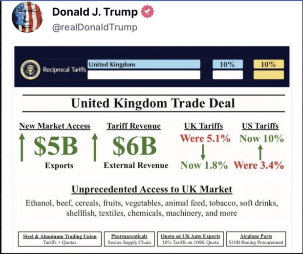 Eric Daugherty: »Trumps Handelsabkommen mit dem Vereinigten Königreich … Medien und Democrats sagten, das sei unmöglich … Großbritannien baut zahlreiche nichttarifäre Handelshemmnisse ab, „die amerikanische Produkte unfair diskriminierten“ – „Milliarden“ für einen verbesserten Marktzugang für US-Exporte, insbesondere Agrarprodukte, Rindfleisch, Ethanol, „praktisch alle Produkte, die von unseren großartigen Landwirten produziert werden“ – Neuer Marktzugang für amerikanische Maschinen und Chemikalien – Großbritannien in die wirtschaftliche Sicherheitsausrichtung mit den USA bringen – Gewährleistung einer starken industriellen Basis und Schutz für Stahl – Bestätigung von Gegenseitigkeit und Fairness«