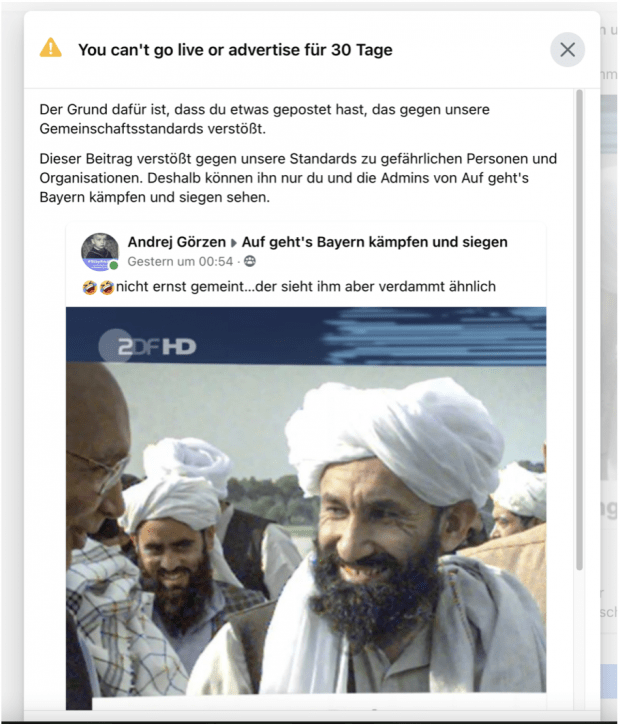 Facebook hat also einen Screenshot des ZDF, in dem das Wort “Taliban” auftaucht (weder Görzen noch ich nehmen es in den Mund), als Unterstützung einer gefährlichen Organisation iSd oben erwähnten “Standards” bewertet. Facebook hat den Inhalt in der Bayern-Gruppe gelöscht und Herrn Görzen sanktioniert (30 Tage nicht live gehen und keine Werbung schalten).