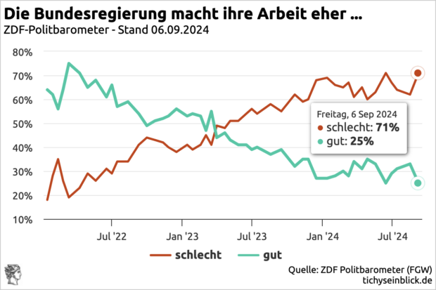 Wenn das ZDF-Politbarometer eine Unzufriedenheit mit der Regierung, „wie wir sie bisher noch nicht kannten“ misst (Matthias Jung, Forschungsgruppe Wahlen), brennt das Ampel-Dach, auch wenn die drunter es nicht merken (wollen).