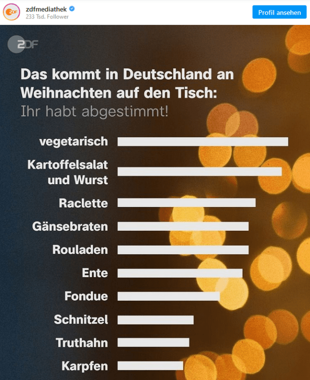 Nach dem Ende der Umfrage schrieb der Kanal: „Tatsächlich essen die meisten aus der ZDF-Community zu Weihnachten vegetarisch. Hättet Ihr das gedacht?“ Angehängt war eine Grafik ohne Prozente oder absolute Zahlen, sondern nur mit verschieden langen Balken. Ganz oben stand tatsächlich der Balken mit der Antwort „vegetarisch“.