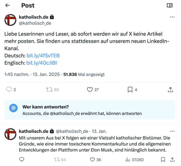 Auch Unterstützung, Zuspruch und Mitgefühl begegnet man hier: Menschen suchen über X beim Joggen verlorene Erbstücke, Hunderte nehmen Anteil, bangen mit, und freuen sich, wenn es wiedergefunden wurde. Kommentare sprechen Verzweifelten Mut zu, motivieren Verzagte, trösten Trauernde. Vielsagend, dass das Portal der katholischen Kirche in Deutschland von X zum Businessforum LinkedIn abwandert – mit Evangelisierung und Begegnung hat man es dort wohl nicht so.