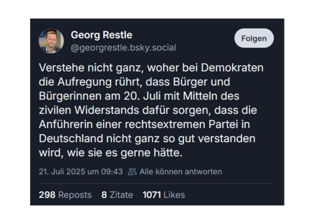 Der 20. Juli 1944 ist nicht der Termin des Nationalsozialismus, sondern der Termin des Widerstands. Nationalsozialismus war von 1933 bis 1945, der Widerstand aber am 20. Juli. Das werden die ARD-Geschichtsblinden möglicherweise nicht beabsichtigt haben, aber durch die Terminwahl haben sie Weidel gerade mit dem Widerstand in Verbindung gebracht, nicht mit der NS-Herrschaft. Es war also keine „kleine Bosheit“, wie der Autor hier fälschlich meint, sondern eine große Dummheit. Umso besser.