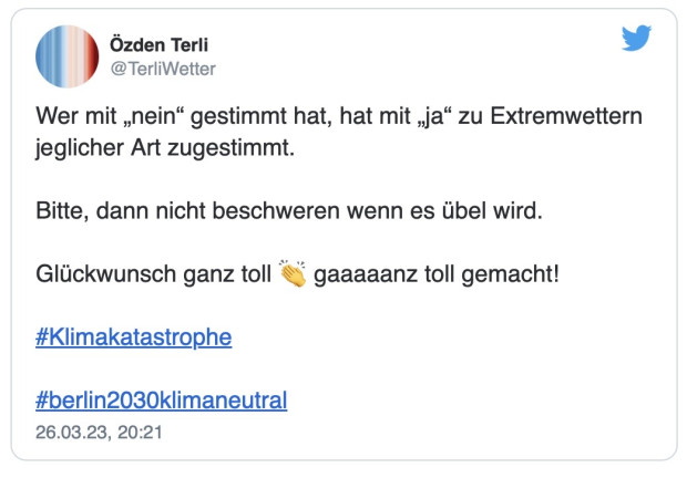 Bei diesen geheimnisvollen Kräften handelte es sich um die Berliner Bürger, die entweder nicht zur Abstimmung gingen oder mit Nein votierten. Dieses Verhalten – gegen einen undurchführbaren Plan stimmen – halten die Klimakämpfer in öffentlich-rechtlichen Anstalten und anderswo offenbar für einen Skandal. Der ZDF-Wetteransager Özden Terli etwa erregte sich auf Twitter über so viel Renitenz der Berliner, und machte sie direkt für kommende „Extremwetter“ verantwortlich.