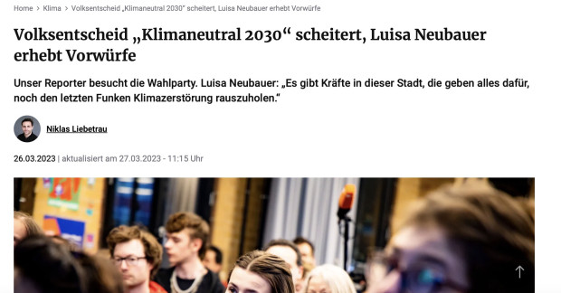 Ihr sensationelles Scheitern bewirkte bei den Kampagnenmachern nicht etwa Selbstkritik oder gar Demut. Sondern Wut und Trotz. Luisa Neubauer raunte am Sonntagabend düster: „Es gibt Kräfte in dieser Stadt, die geben alles dafür, noch den letzten Funken Klimazerstörung rauszuholen“.