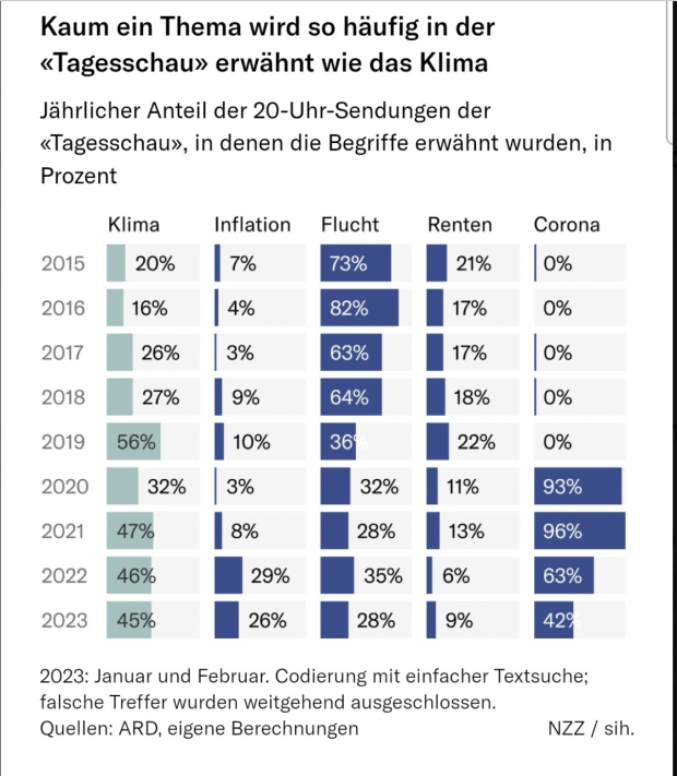 Das zielgerichtete Trommeln passte auch gut zur Sendepolitik des ARD-Flaggschiffs Tagesschau. Nach einer Auswertung der NZZ stieg der Anteil der Nachrichtensendungen, in denen der Begriff „Klima“ vorkommt, steil an – von 20 Prozent im Jahr 2015 auf 46 Prozent 2022. Zum Vergleich: Inflation, für die Mehrheit der Bundesbürger ein drängendes Problem, kam bei der Tagesschau 2022 gerade in 26 Prozent der Sendungen vor. Und Renten – trotz des drohenden demografischen Desasters ab 2030 – gerade in 9 Prozent der ARD-Hauptnachrichten.