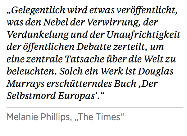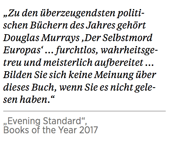 Murrays Buch liest sich wie eines dieser beeindruckenden englischen Geschichtswerke — mit dem kleinen Unterschied, dass wir nicht in ferne Vergangenheiten schauen, sondern mittendrin sind im Geschehen. Etwa so, als würde man die Geschichte des Ersten Weltkriegs schon 1916 lesen können. Inklusive Schuldanalyse und dem Ausgang der Katastrophe. Und der Autor lässt kaum Zweifel aufkommen, dass am Ende der Entwicklung, die mit Angela Merkels einsamer Entscheidung, Europas Grenzen zu öffnen, ordentlich Fahrt aufnahm, sich vieles zum Schlechteren wandeln wird.
