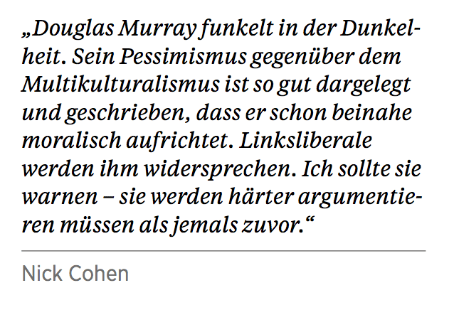 8. Seit ca. 1 Jahr google ich nach „Douglas Murray“ und „deutsch“ – ohne jeden Erfolg. Als ich nun endlich fündig wurde, habe ich es sofort bestellt. Die erste, original verpackte Auflage liegt bereit und wartet geduldig auf mich.