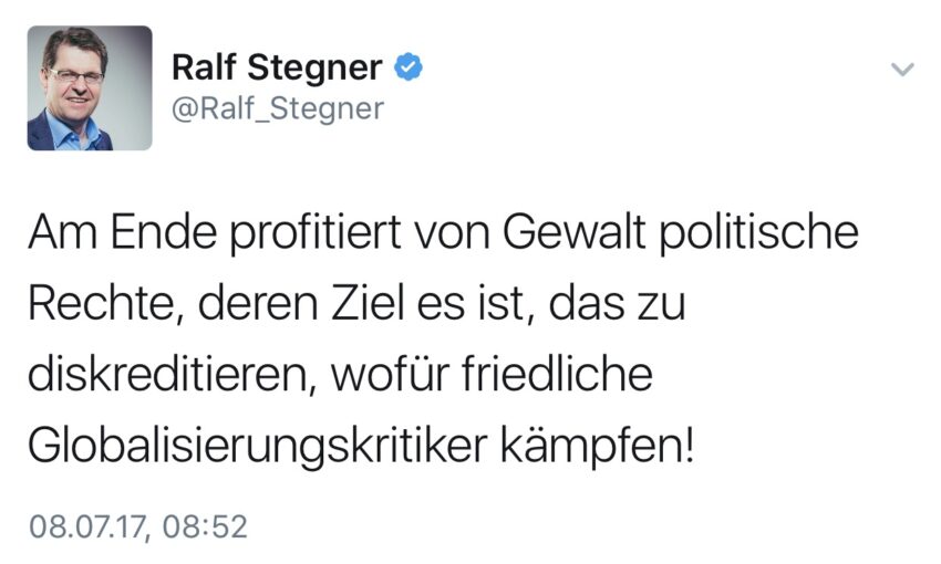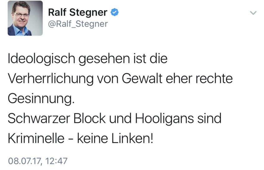 Doch nein, unser Volksaufklärer Stegner bietet die ideologisch saubere Lösung an, die in den gleich aufgeklärten Medien auch sofort aufgegriffen wird: Wer Gewalt anwendet und trotzdem nicht „rechts“ ist, ist kriminell. Damit fädelt Stegner wieder in die vorbildlich einfache Weltsicht seines Mitgenossen Michael Roth ein:
