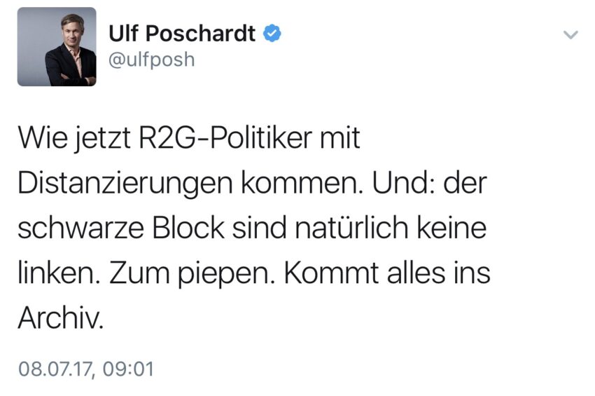 Dann beschmutzt auch noch Jan Fleischhauer das Stegner’sche Weltbild, igitt. Doch dieser setzt selbst einen Riss in sein’s, lässt seine Formulierung nun doch zu, dass es erstens „unanständige“ Linke geben kann und solche „was mit Gewalttätern gemein“ haben könnten. Ist Ralf Stegner nicht ideologiefest? Oh, oh …