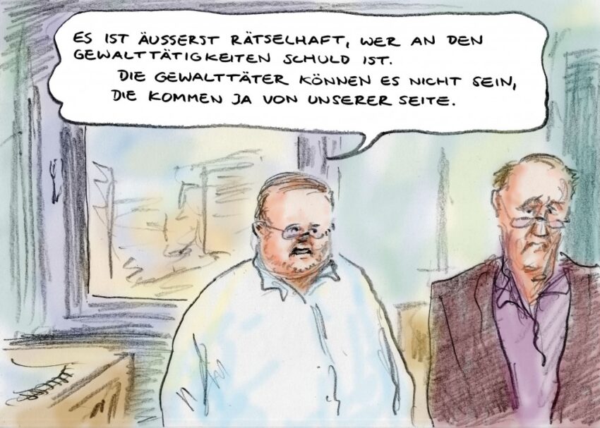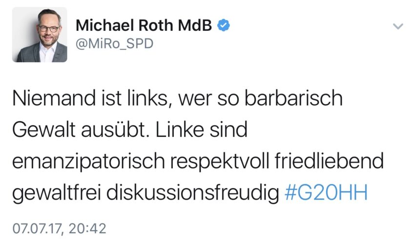Ist es denn so schwer, die aktuelle Analogie zu erkennen? Selbstverständlich hat die Gewalt des schwarzen Mobs nichts mit „links“ zu tun. So wie ein Gewalttäter kein Muslim sein kann, so ist er selbstverständlich auch nicht links. Er missbraucht diese menschenfreundliche Ideologie doch nur. Die wahren Opfer der Gewaltexzesse sind also, na? Richtig, die bedauernswerten Linken jeder Einfärbung.