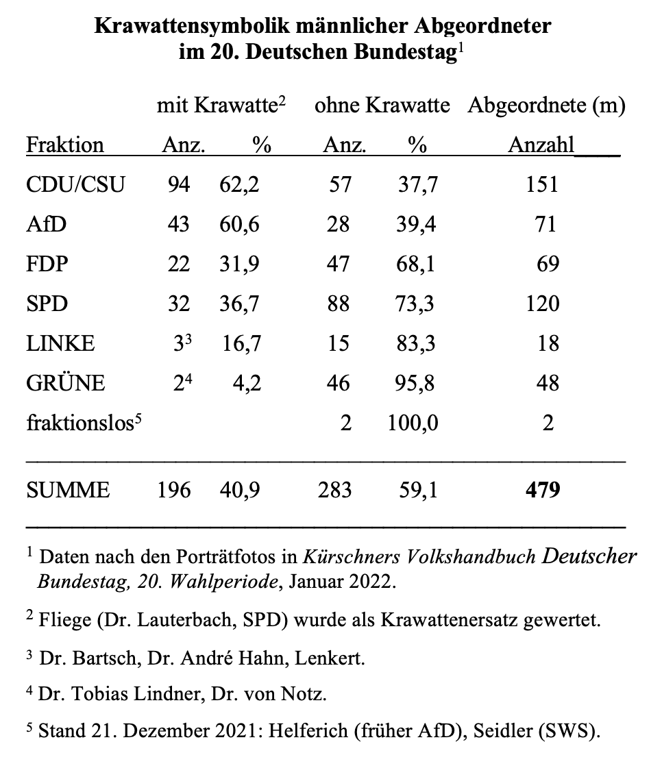 Trotzdem ist die Krawatte im Bundestag 2021 noch kein Auslaufmodell. In zwei Fraktionen, CDU/CSU und AfD, trägt sie noch die Mehrheit (rund 60 Prozent) der männlichen Abgeordneten. Bei SPD und FDP bilden die Krawattenträger zwar eine Minderheit, aber eine beachtliche (über 30 Prozent); bei der Die Linke sind sie nur noch eine kleine Minderheit (17 Prozent, einschließlich des Fraktionsvorsitzenden) und bei den Grünen eine verschwindende (4 Prozent). Zu Details vgl. die Statistik am Ende des Beitrags.