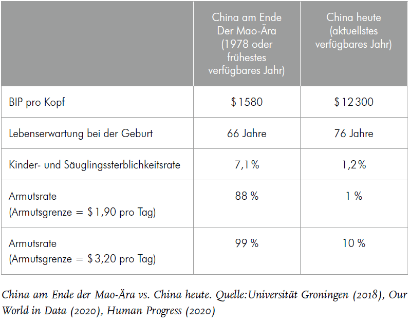 Das Ergebnis war ein echter »großer Sprung nach vorn«. Das Pro-Kopf-Einkommen hat sich im Laufe einer Generation real verachtfacht, die Lebenserwartung ist um ein Jahrzehnt gestiegen, die Kindersterblichkeit ist auf ein Sechstel ihres damaligen Niveaus gefallen. Fast die gesamte chinesische Bevölkerung konnte sich aus der extremen Armut befreien. Ein reiches Land ist China deswegen noch lange nicht, und so beeindruckend Chinas Aufholjagd auch aussehen mag, so verblasst sie doch im Vergleich zu dem, was hätte sein können. Taiwan liegt heute vom realen Einkommensniveau her gleichauf mit der Bundesrepublik Deutschland, Hongkong sogar noch darüber. Auch ist China nach wie vor eine Einparteiendiktatur, und wie schlecht es um die Menschen- und Bürgerrechte dort nach wie vor steht, muss hier nicht eigens erörtert werden.