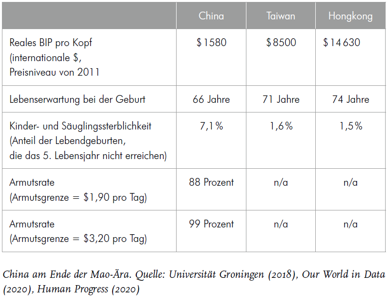 Am Ende der Mao-Ära lag das Einkommensniveau Chinas bei nur einem Fünftel dessen Taiwans und bei kaum mehr als einem Zehntel dessen Hongkongs. Fast die gesamte chinesische Bevölkerung lebte damals in Armut. Die Bürger Taiwans lebten im Schnitt fünf Jahre länger als Festland-Chinesen, die Bürger Hongkongs sogar acht Jahre. Die Kinder und Säuglingssterblichkeit war in China mehr als viermal so hoch wie in Taiwan oder Hongkong.
