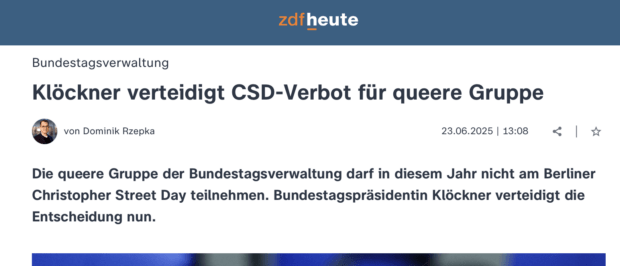 Natürlich tut sie das nicht. Und selbstredend handelt es sich bei der Zeile des Berliner Blattes um puren Unfug. Etwas anders, aber immer noch falsch agitiert das ZDF sein Publikum. „Klöckner verteidigt CSD-Verbot für queere Gruppe“, heißt es auf der Seite der vorgeblichen Nachrichtensendung „heute“.